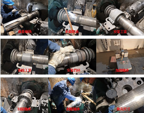 1、 修復步驟:根據軸的結構形式加工工裝,然后對軸進行表面處理,去除氧化層并使得表面粗糙干凈,按照A:B雙組份6:1(重量)比例調和RJ109金屬修復劑,攪拌均勻后涂覆至軸的磨損部位。