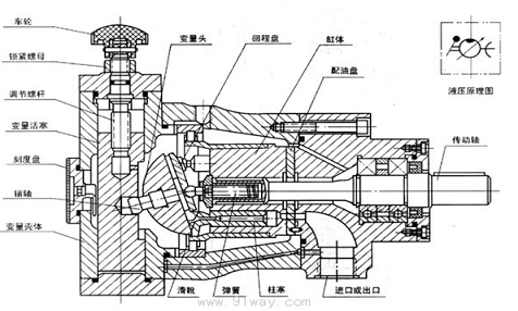 柱塞泵是往復泵的一種,屬于體積泵,其柱塞靠泵軸的偏心轉(zhuǎn)動驅(qū)動,往復運動,其吸入和排出閥都是單向閥。當柱塞外拉時,工作室內(nèi)壓力降低,出口閥關(guān)閉,低于進口壓力時,進口閥打開,液體進入;柱塞內(nèi)推時,工作室壓力升高,進口閥關(guān)閉,高于出口壓力時,出口閥打開,液體排出。當傳動軸帶動缸體旋轉(zhuǎn)時,斜盤將柱塞從缸體中拉出或推回,完成吸排油過程。柱塞與缸孔組成的工作容腔中的油液通過配油盤分別與泵的吸、排油腔相通。變量機構(gòu)用來改變斜盤的傾角,通過調(diào)節(jié)斜盤的傾角可改變泵的排量。